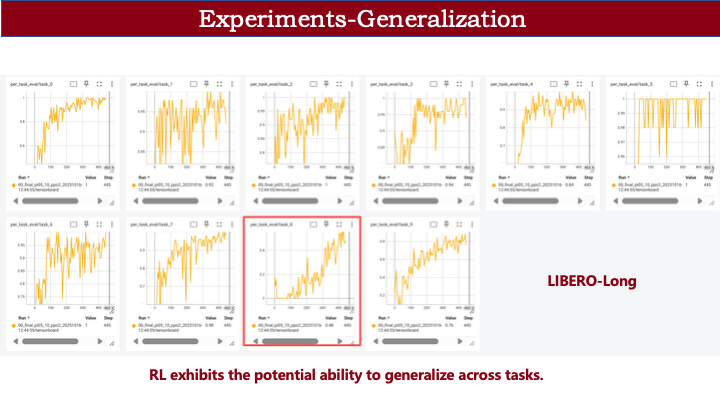 我们还观察到一个有趣现象:在 LIBERO-Long 任务中,task 8 在前 100 步内成功率始终为 0(因稀疏奖励,无成功即无奖励,理论上无法训练)。但随后成功率突然上升。这是因为其他任务中学到的通用动作能力迁移到了该任务,使其获得初步成功,进而形成正反馈,性能被拉起。
