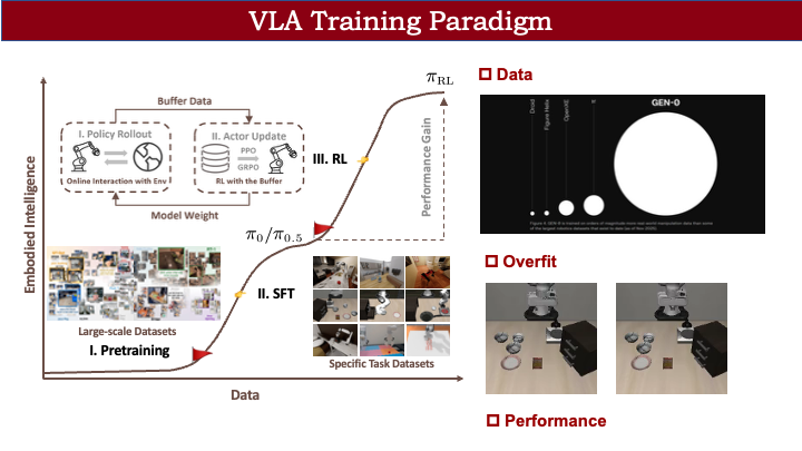 第三个是性能上限问题。SFT 的性能受限于专家轨迹的质量。如果专家轨迹质量差,即使使用再强大的 VLA 模型,也无法训练出高性能策略。这是一个根本性的瓶颈。