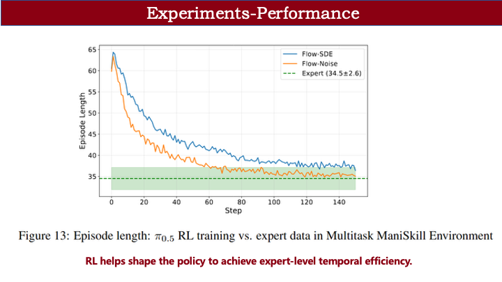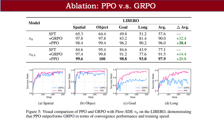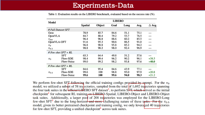 - π-0.5 仅用 40 条轨迹(LIBERO 有 4 个子任务,每任务 10 个小任务,共 40 条示范),SFT + RL 也能取得不错性能。