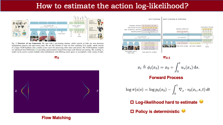已有理论表明,我们可以根据 X _ 0 X\_0 X_0 的分布推导出 X _ 1 X\_1 X_1 的动作输出分布。但这一过程需要在每个时间步计算流场的散度。当动作维度较高时,散度计算代价极大,导致对数似然难以估计------这与 OFT 或 OpenVLA 的情况不同。