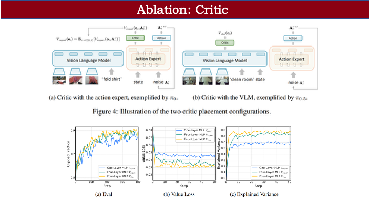 - 在 π-0 上对比 critic 位置:接在 VLM 后的效果反而更好。这看似反直觉(因缺少 state 信息),但实际是因为 action decoder 后的 critic 需解耦动作噪声,对优化造成轻微阻碍。尽管差异不大,我们仍为 π-0 采用 VLM 后接 critic 的方案。