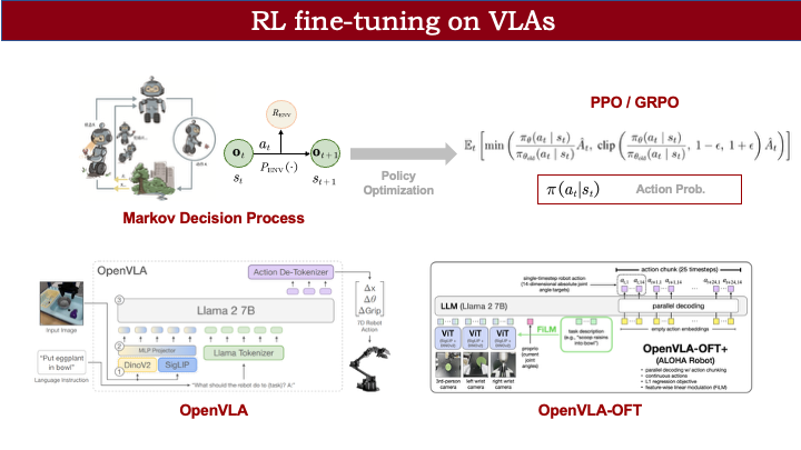 我们的目标是通过在线学习的方式(如 PPO、GRPO),让模型与环境交互。环境可以反馈"什么样的动作更好",模型便能在交互过程中自动学习更优的策略参数。这就是 VLA+RL 在 VLA 训练中的作用。