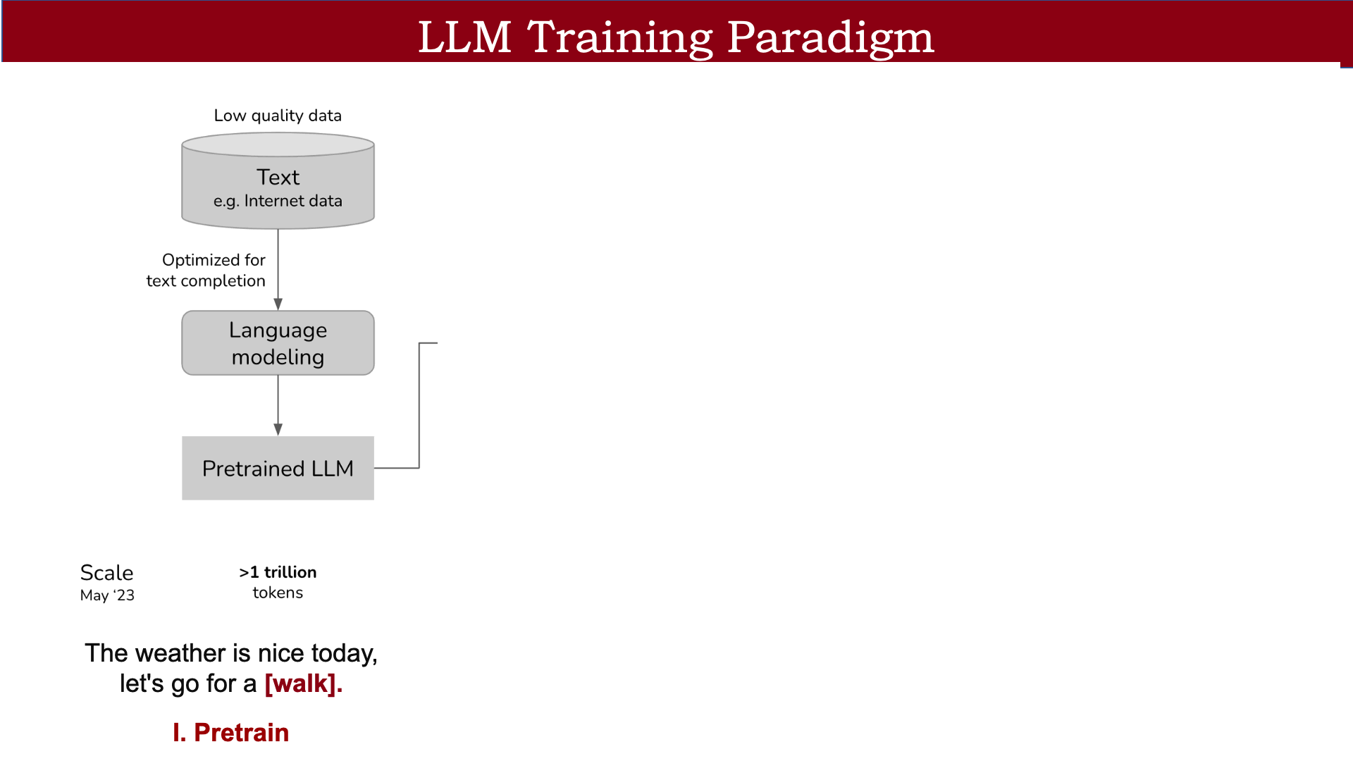 第一个阶段是预训练,我们会将完整句子进行掩码处理,例如挖掉其中一个词,让模型预测下一个词,从而训练其基本的文本补全能力。