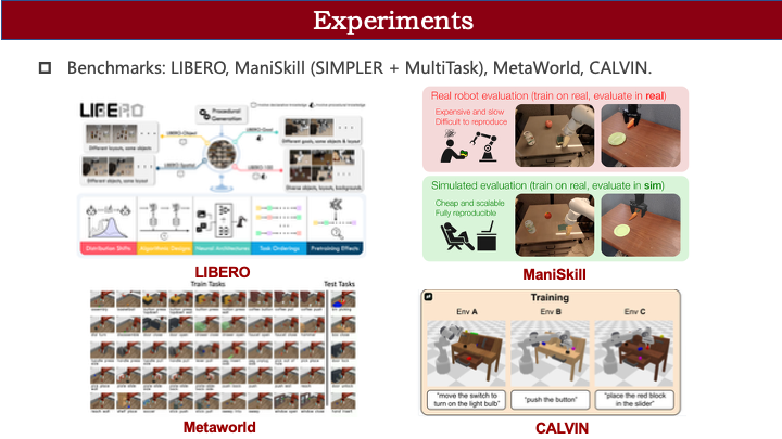 前面主要是理论部分,现在进入实验环节。我们在 LIBERO、ManiSkill、Metaworld 和 CALVIN等 benchmark 上进行了全面测试,并正在支持更多框架。