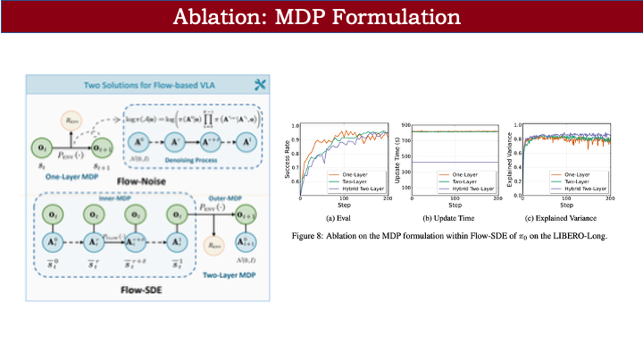 此外,无论是单层还是双层 MDP,都面临一个效率问题:像 OpenVLA 或 OFT 这类模型输出动作是一次性的,buffer 中存储的数据较少;而 flow policy 因包含迭代去噪过程,buffer 规模更大。如何在保持性能的同时提升速度?