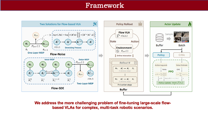 此前,在 2025 年 5 月前后,已有大量 VLA 的 RL 工作涌现,例如 OpenVLA 的 RL 方法。但这些工作基本局限于 OpenVLA 和 OpenVLA-OFT 等模型,并未应用于 π-0 和 π-0.5 这类基于流匹配(flow matching)的 VLA 框架。我们这项工作(于 2025 年 10 月推出)主要解决的问题就是:为基于流匹配的 VLA 设计一套可行的强化学习训练范式。