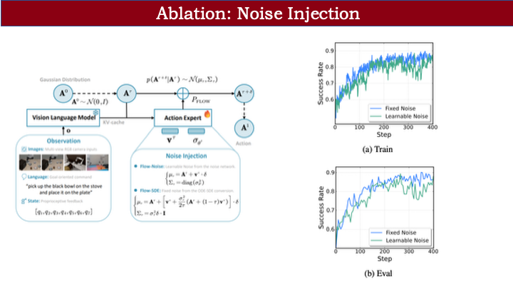 关于噪声注入:可学习噪声与 ODE→SDE 转换两种形式性能相近。前者可能略有精度损失,但可通过 entropy loss 约束,使收敛时噪声趋近于零;后者更简洁,无需额外网络或参数调整。