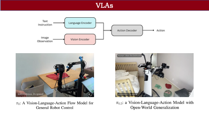 首先,目前大家对 VLA 的定义是:它是一类能够根据视觉和语言信息输出动作的模型。例如之前的 π-0 和 π-0.5 就属于这一类。