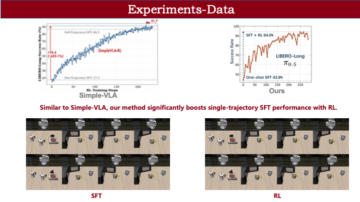 此前社区知名的 SimpleVLA-RL 工作也展示了类似趋势:单轨迹 SFT + RL 即可在 LIBERO-Long长程任务上取得显著提升。可视化可见,单轨迹 SFT 下模型因严重 OOD 而夹爪乱甩;RL 后动作更丝滑,仅个别任务失败。