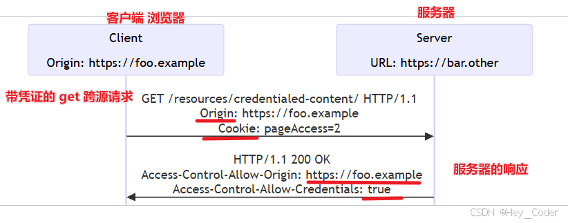 OPTIONS方法 )⇒ ❷ 服务器响应:确定服务器是否允许该跨源请求 ⇒ ❸ 确认服务器允许 ⇒ ❹ 浏览器 发起实际的HTTP请求 。- 服务器端 对预检请求的响应 中,也可以通知客户端,是否需要携带身份凭证(如 Cookie 和 HTTP 认证相关数据)。