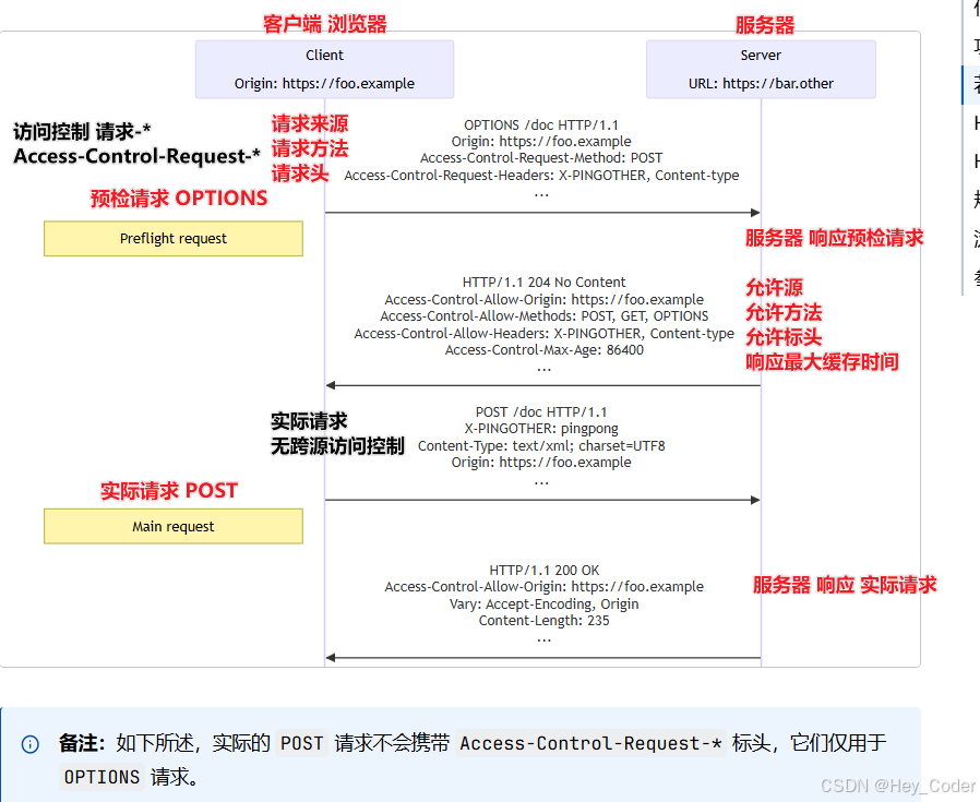 OPTIONS请求) ,直接发送 实际的HTTP请求,对于复杂的请求,浏览器也会自动发出预检请求,不需要手动设置。 Origin⇒ 指明 该请求来源网址 =http://foo.example。