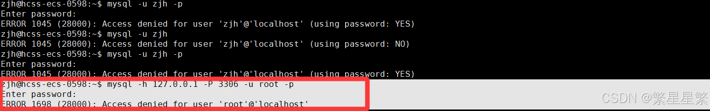 这个报错本质上是 : MySQL 的 root 用户不允许用密码从本地 TCP(127.0.0.1)登录,或者是 root 的认证方式不是 mysql_native_password,导致你输入密码也没用。
