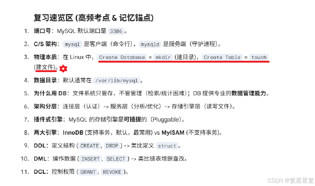 小结:数据库在 Linux 上的物理表现非常朴素:数据库就是目录,表就是目录里的文件。但这套文件系统不由用户直接维护,而是由 mysqld 守护进程代理维护。