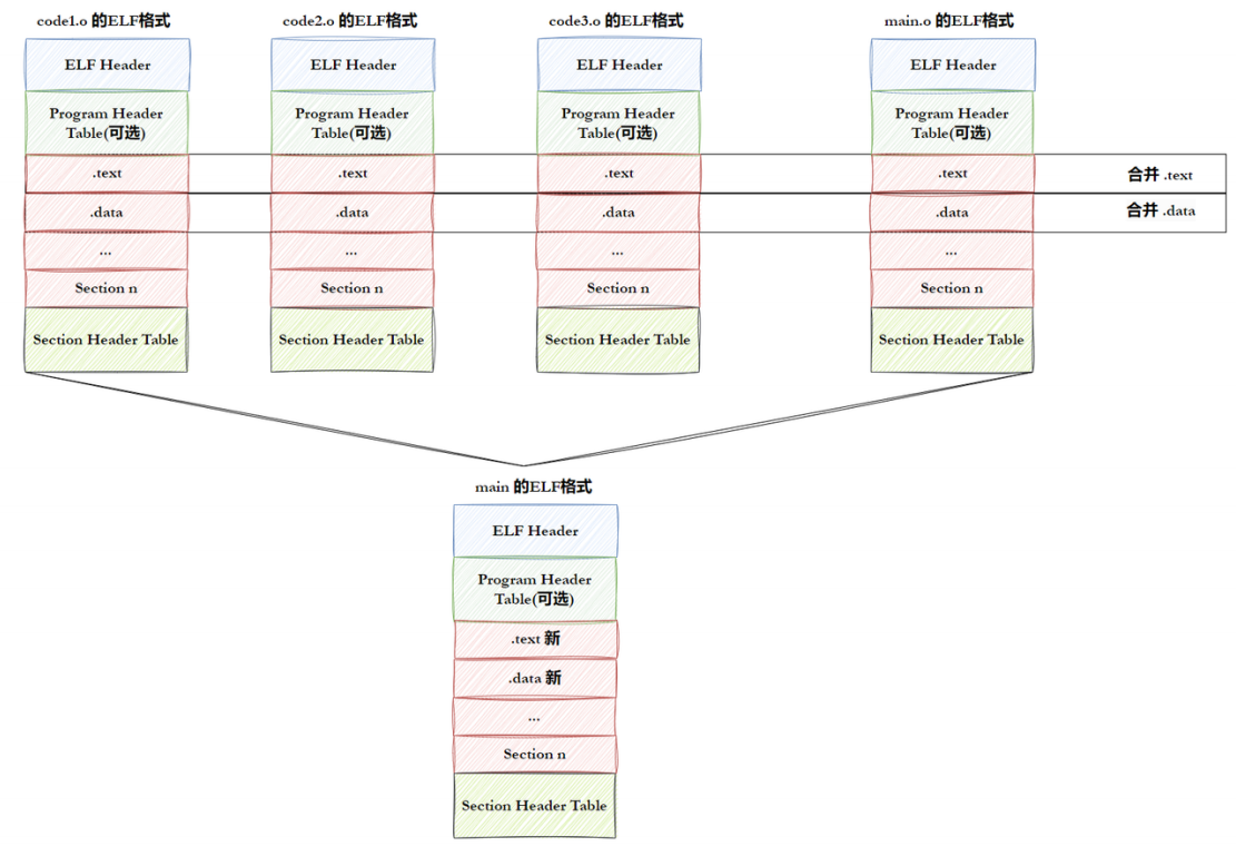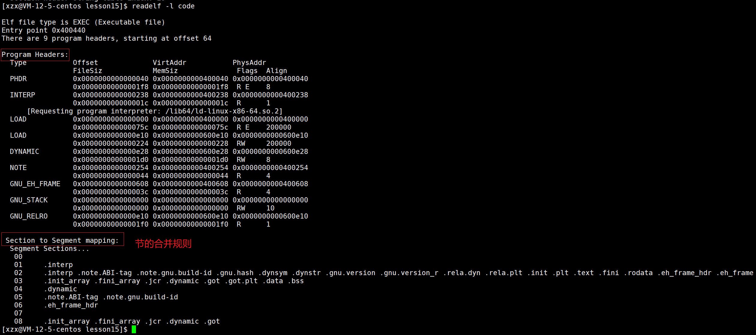 ELF的时候,合并方式已经确定了,具体合并原则被记录在了ELF的 程序头表(Program header table) 中。