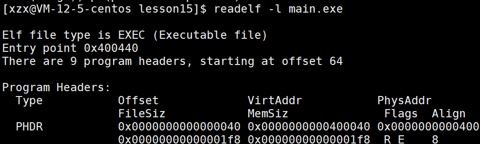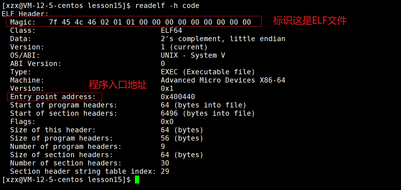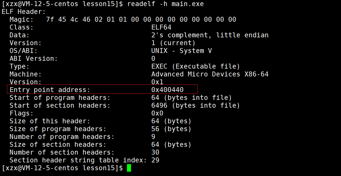 ELF 在被编译好之后,会把自己未来程序的入口地址记录在ELF header的Entry字段中: