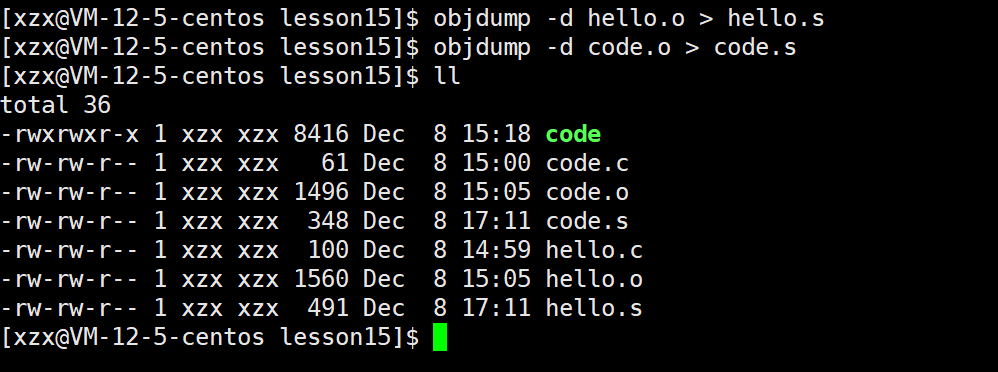 我们将生成的hello.o和code.o文件进行反汇编,看一下汇编代码。