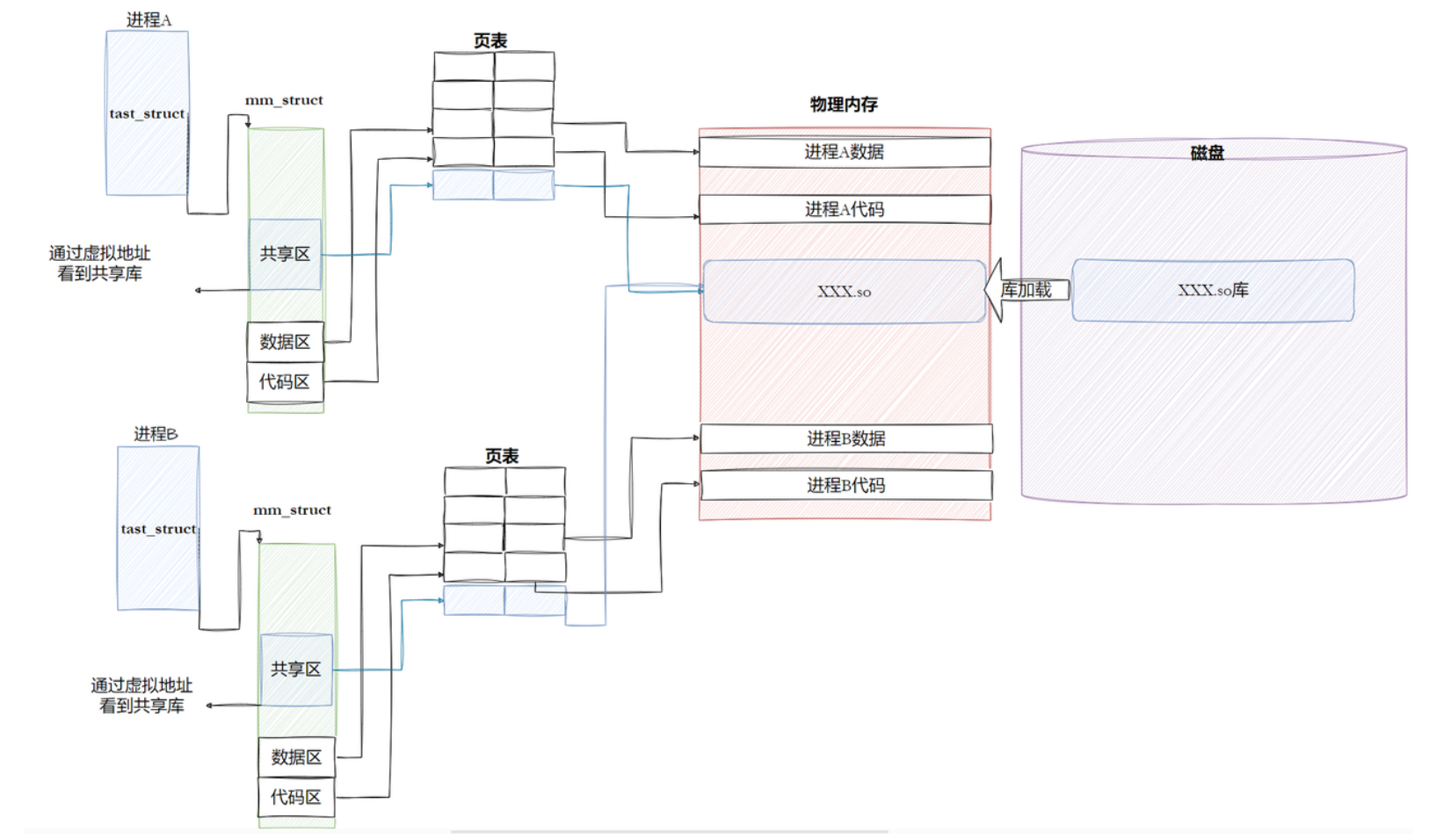 库映射到进程的地址空间中,这样多个进程就共享同一个库了;而在内存中库文件就只存在一份