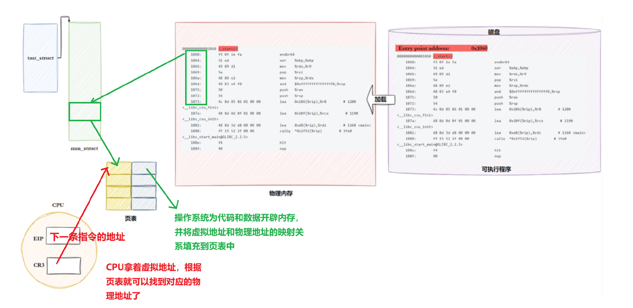 这样CPU就可以拿到程序入口的地址了,拿到这个地址再查看页表找到对应的物理地址,就可以开始执行程序了。