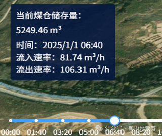 下方有滑块和按钮,可模拟煤仓数据的变化,动态展示不同时间点的仓储量、流入/流出速率等。