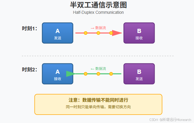 数据流向:可以双向传输,但不能同时(A ↔ B,分时进行)