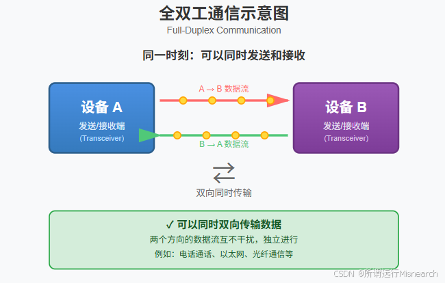 数据流向:可以同时双向传输(A ↔ B)