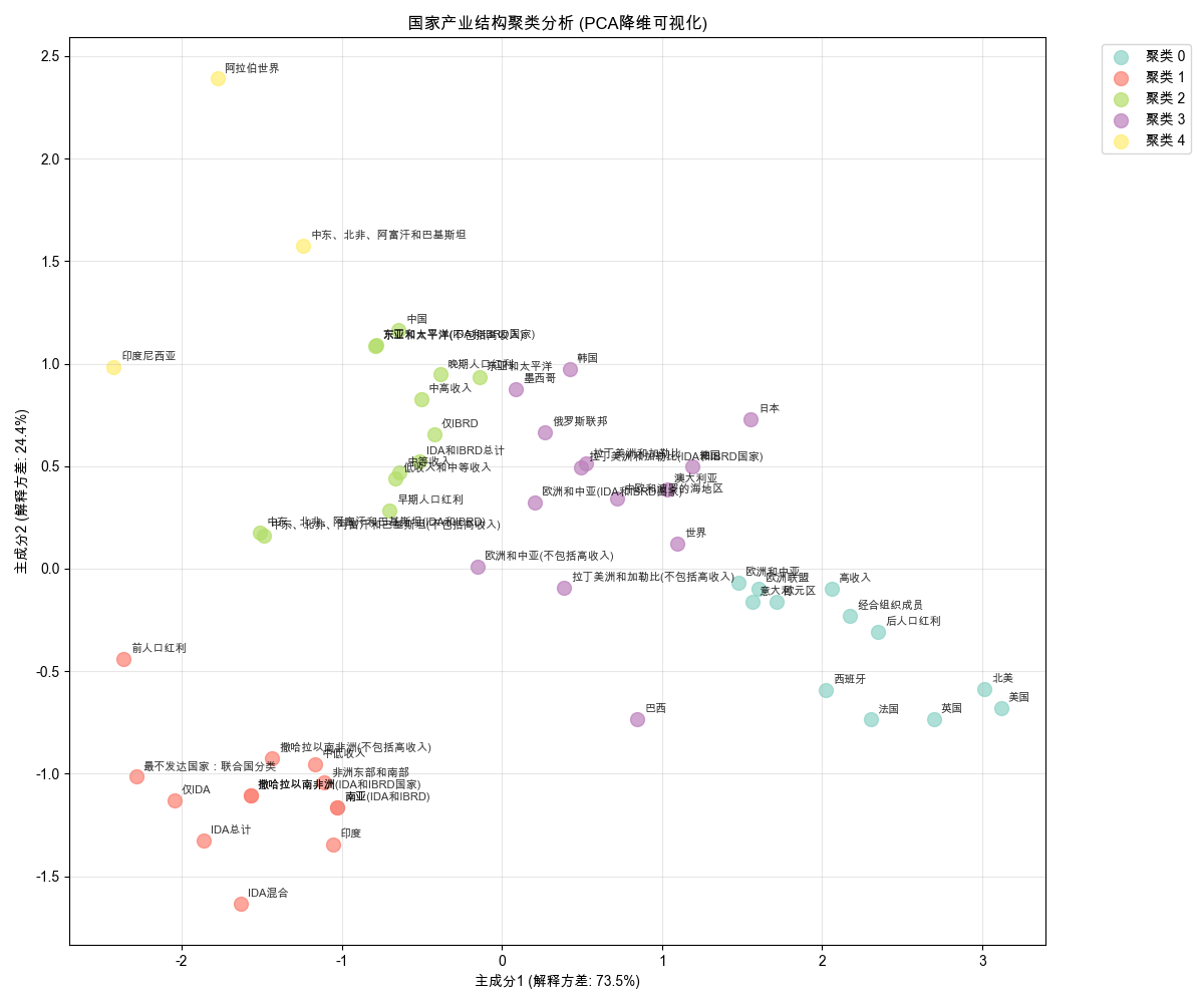 研究方法 :使用K-means聚类算法,以农业、工业、服务业占比和GDP规模为主要变量,经过标准化处理和多次迭代确定最佳聚类数。
