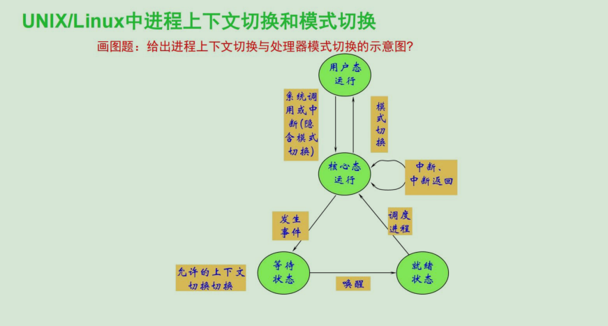 发生事件、唤醒、允许上下文切换、中断/中断返回、调度进程,系统调用/中断(隐含模式切换)