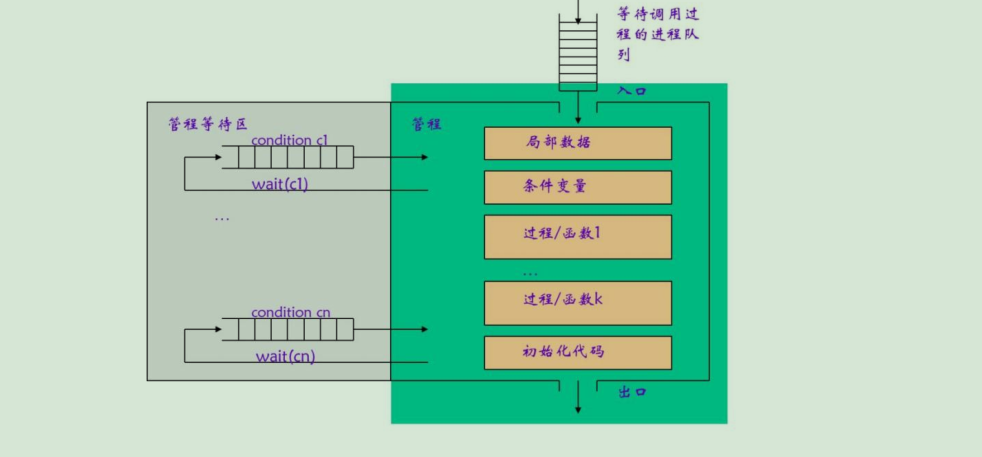 管程等待区:condition c1,wait(c1),condition cn wait(cn)