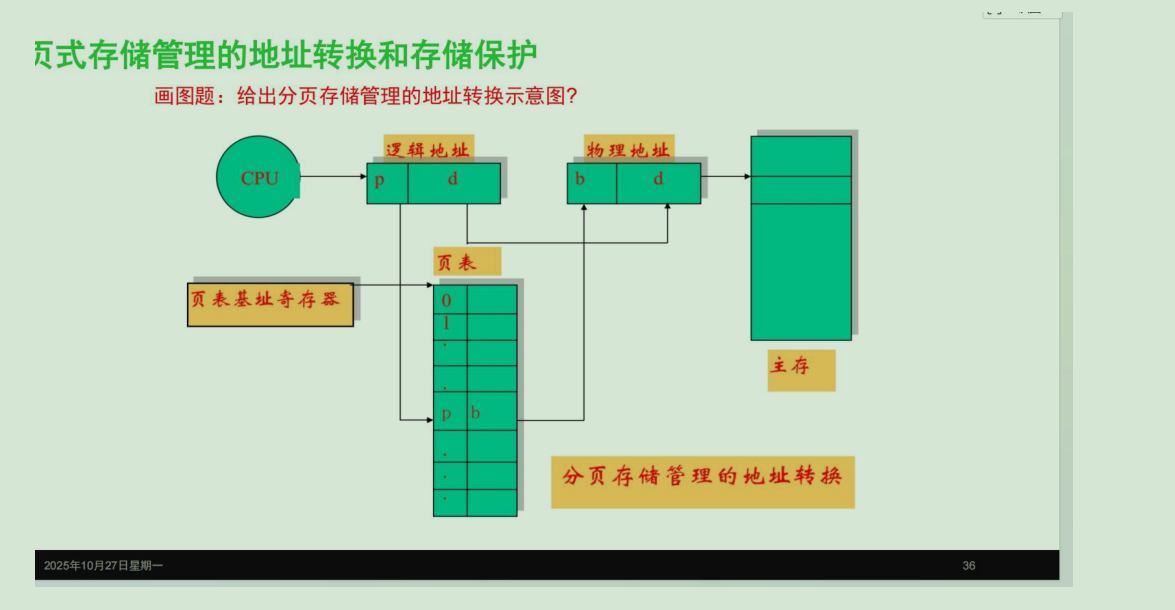 页表基址寄存器、逻辑地址、物理地址、页表、分页存储管理的地址转换、主存。