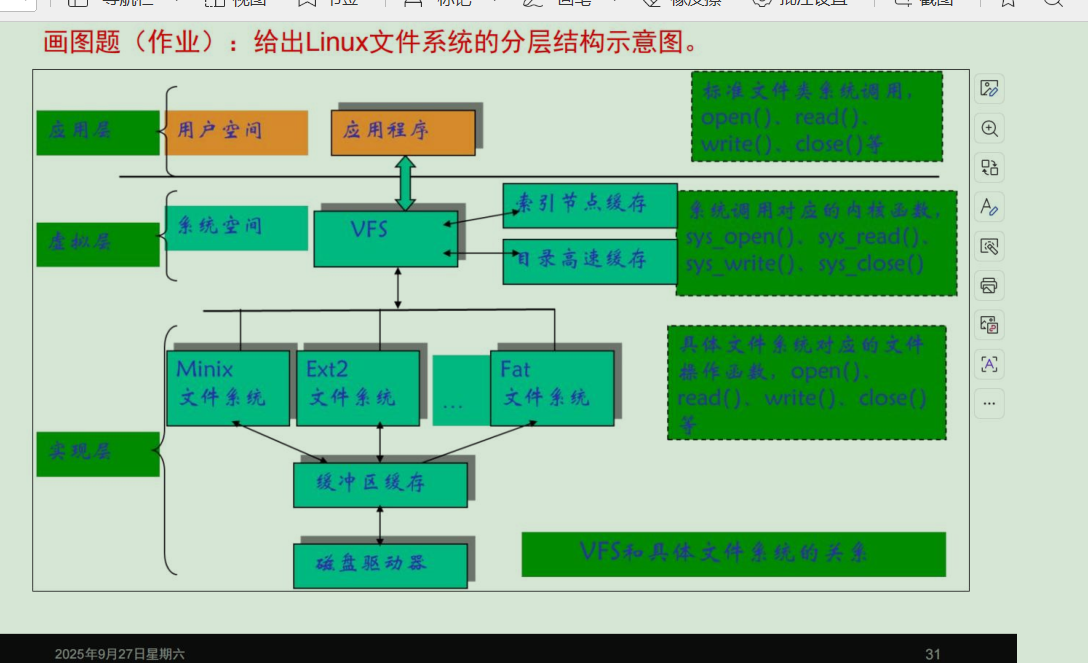 功能有:建立设备与文件系统的联系,记录安装的文件系统类型,实现面对文件的通用操作,涉及特定文件系统的操作时映射到具体文件系统中去。