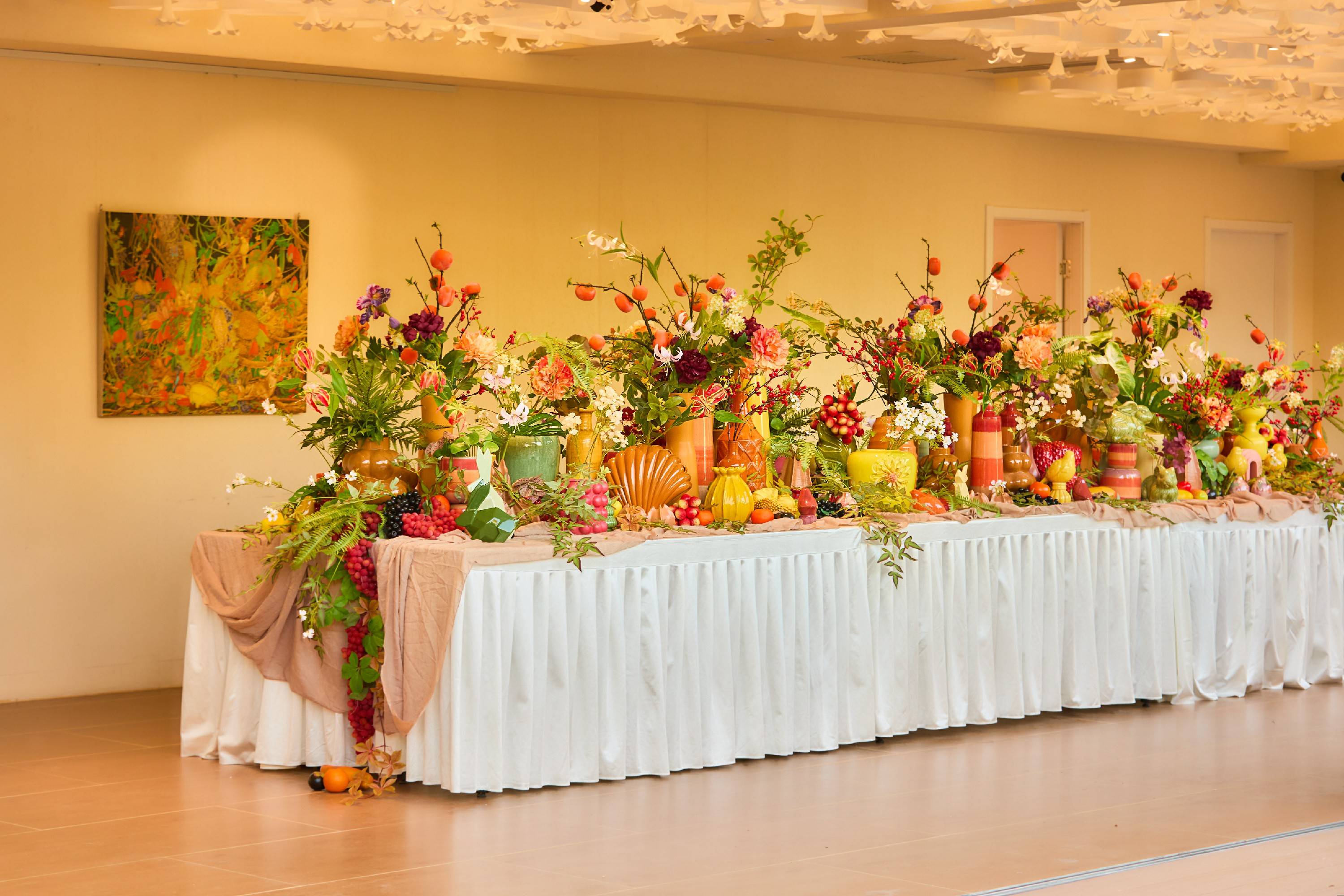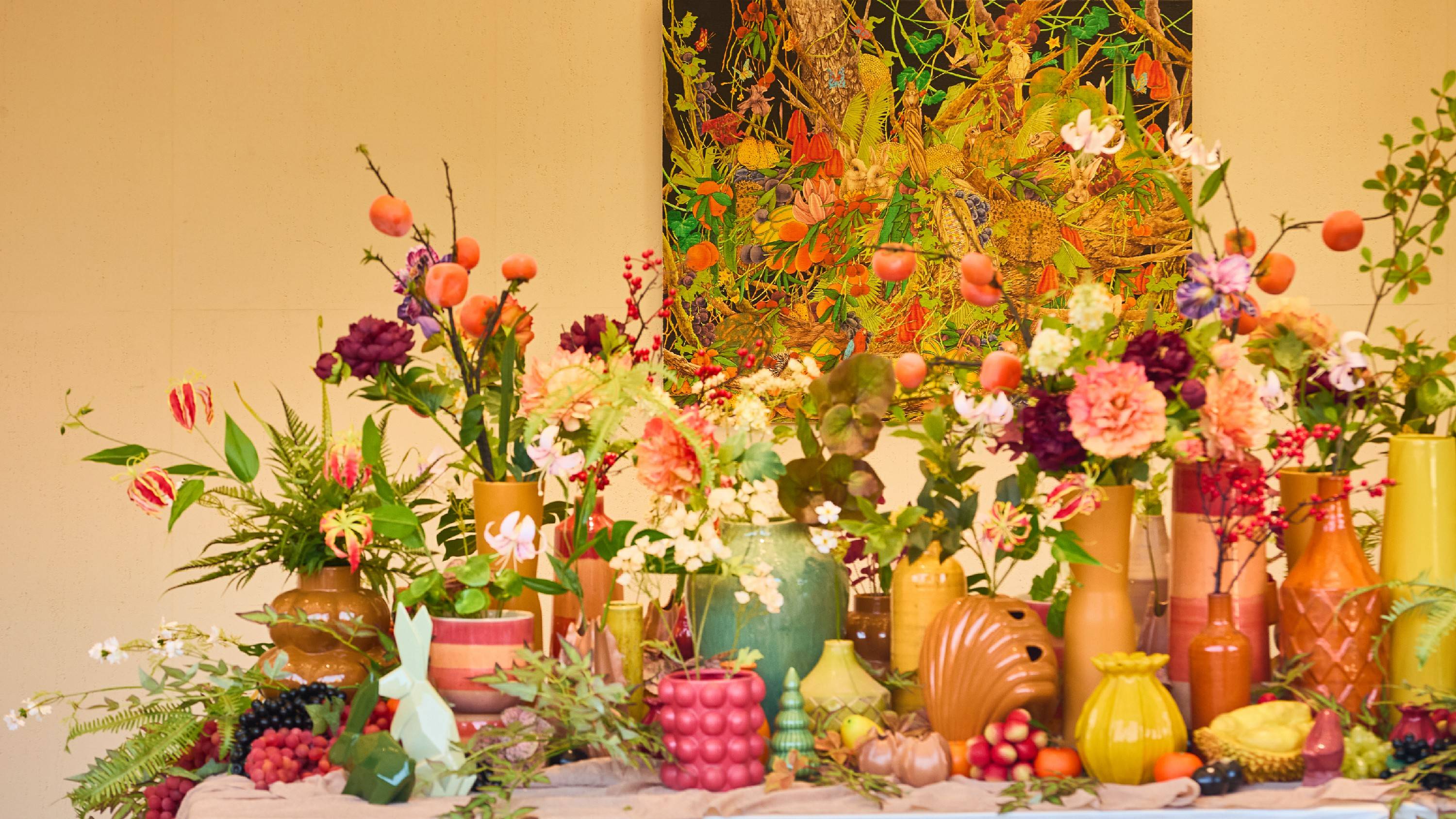 元素复刻:将画作中的果蔬、生灵意象搬进花艺场景,还原画面里"花与果共生"的鲜活感;既有抽象的形态设计,灵动又治愈;