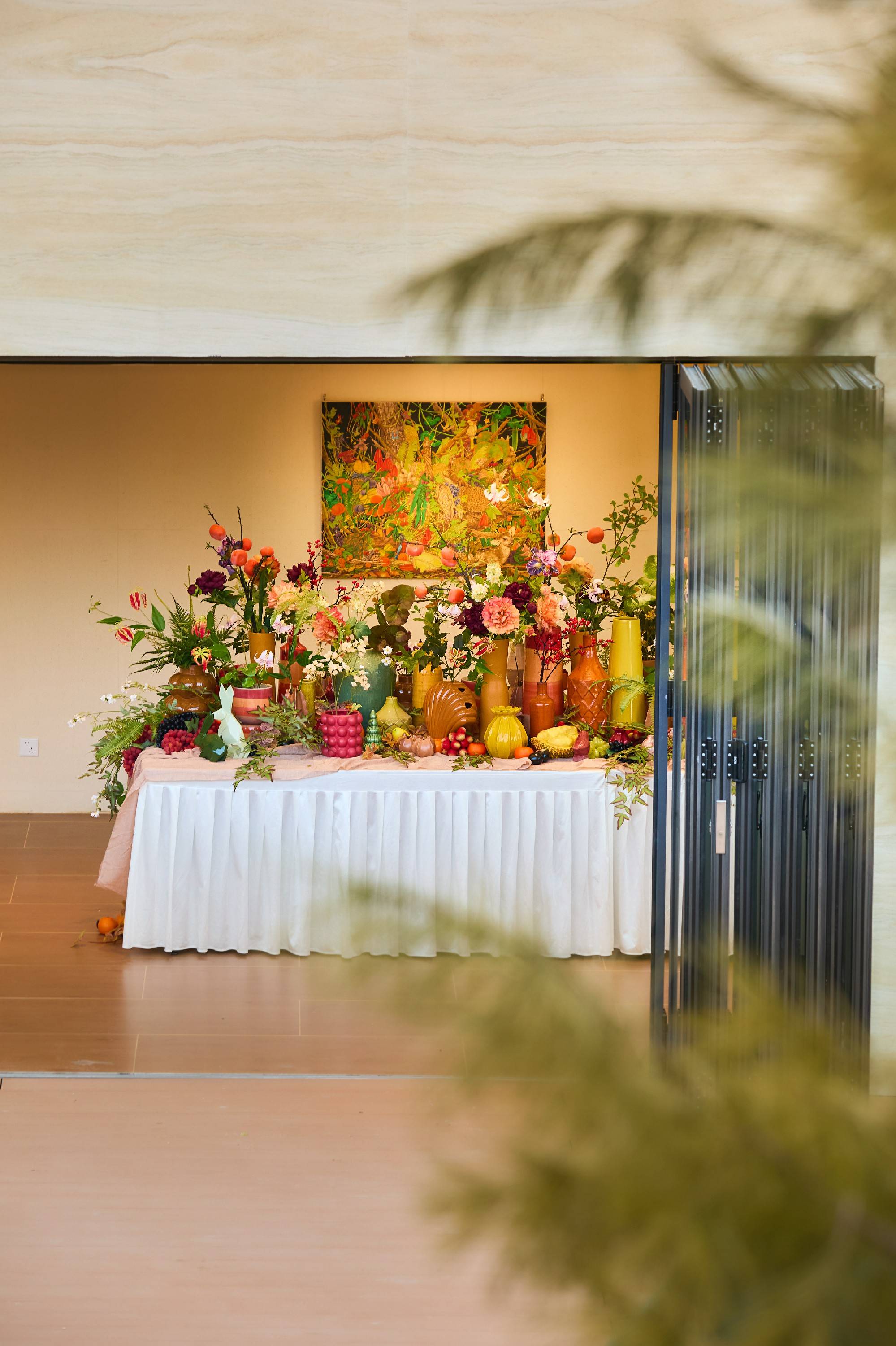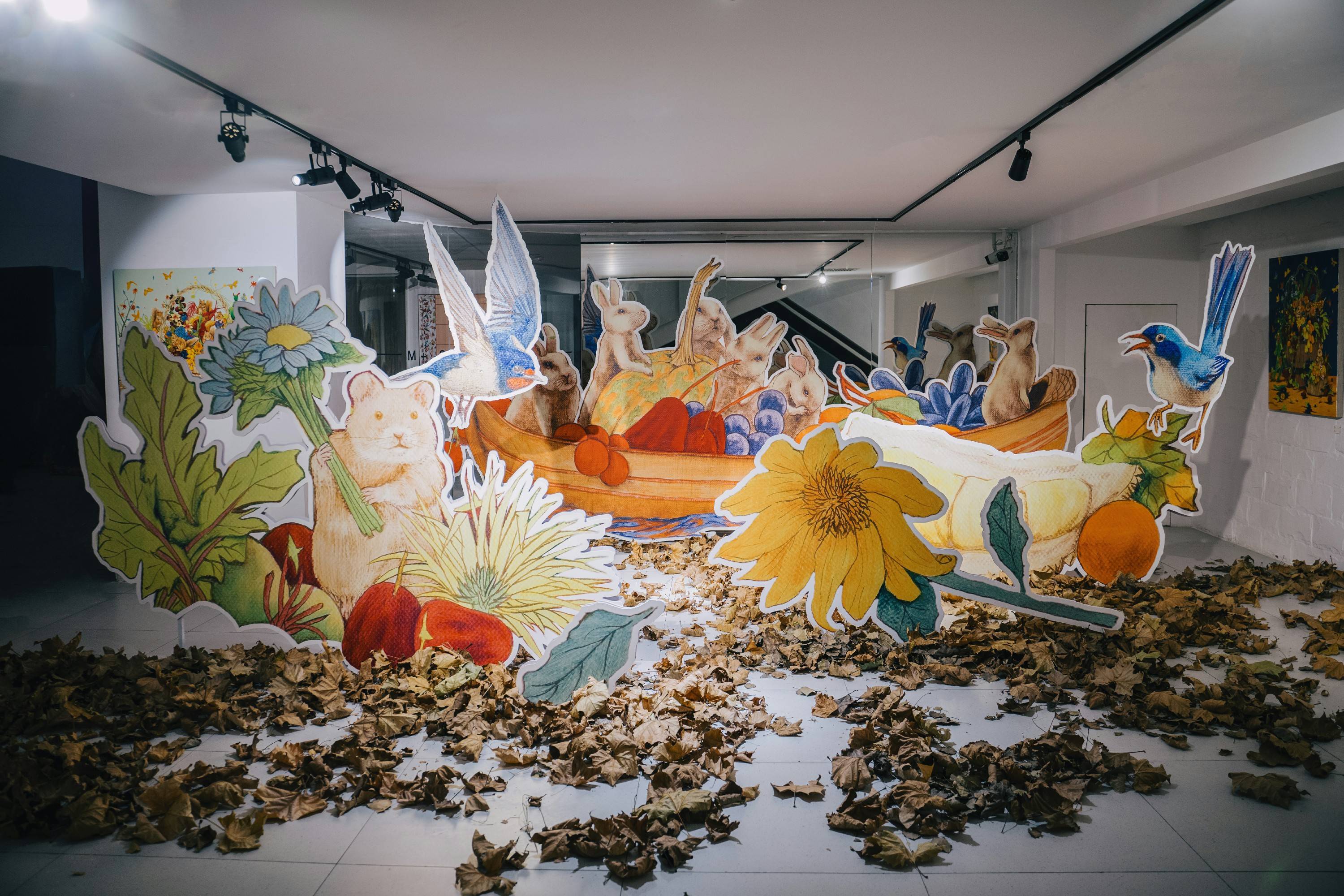 当艺术画作与自然花艺相遇,会碰撞出怎样的精神共鸣?在北京 CBD 商圈的摩卡艺术中心,全新展览《未知栖息地》正以一场跨媒介的艺术对话惊艳观众------除了艺术家李龙飞笔下承载情绪的生灵画作,策展人潘珍玉特别邀请新加坡花艺大师高炎发,在首次开放的全新场地M+花园打造专属花艺装置。高炎发以李龙飞的作品为灵感源泉,用花材、果实与陶瓷装置构建出"画中有花、花映画境"的沉浸式场景,让"秋冬暖岛"的温馨氛围在自然与艺术的交融中愈发浓郁。更让摩卡艺术中心的多元空间价值进一步凸显。