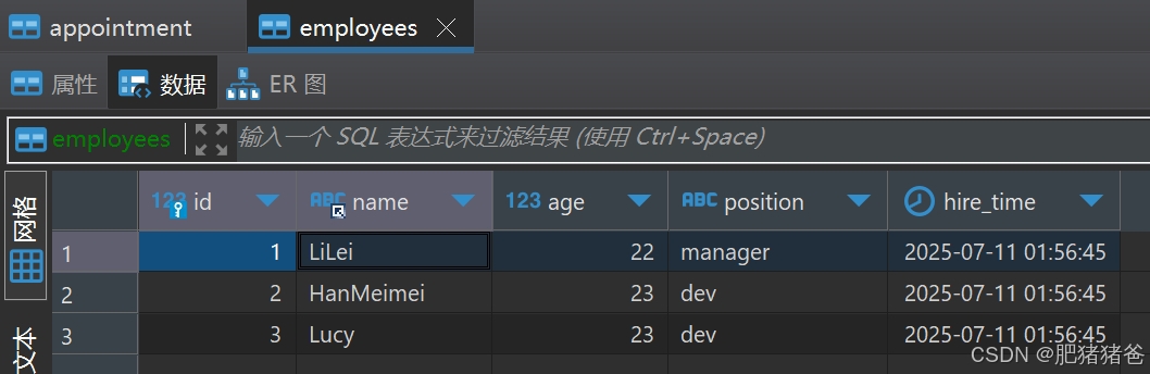 其中employees中数据如下