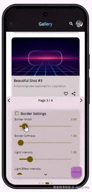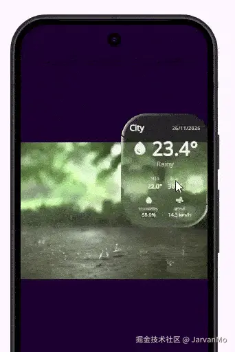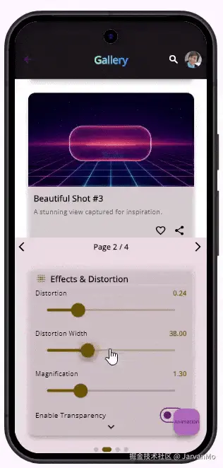 LiquidGlassEasy模拟了真实的玻璃物理特性 ,包括完整的折射、扭曲和流体响应能力 。 它能实时捕获并折射 (refract)实时背景内容,从而产生身临其境、响应动态 的视觉效果,为你的 UI 带来深度和真实感。