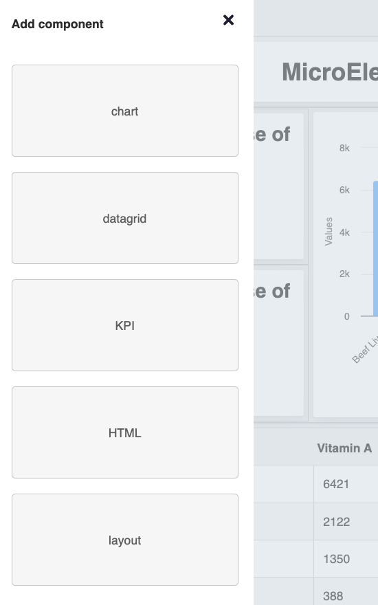 Add Component 按钮允许用户添加新组件。点击后,会出现一个侧边栏, 它让你选择要添加的组件类型,然后通过拖放操作,可以选择组件类型并拖动到正确的位置, 位置由放置标记指示。
