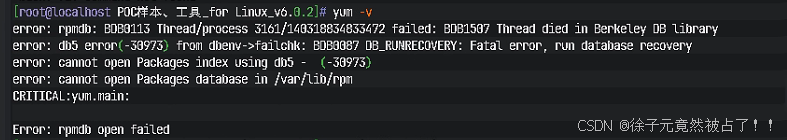 RPM 数据库打开失败,yum 依赖 rpmdb 所以直接崩溃 |