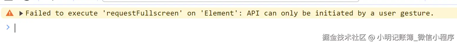 💥 requestFullscreen方法只能是用户主动触发才可以,如果想在页面加载时通过js调用方法或者是触发click事件触发,我劝你还是放弃吧,在控制台出现如下警告: