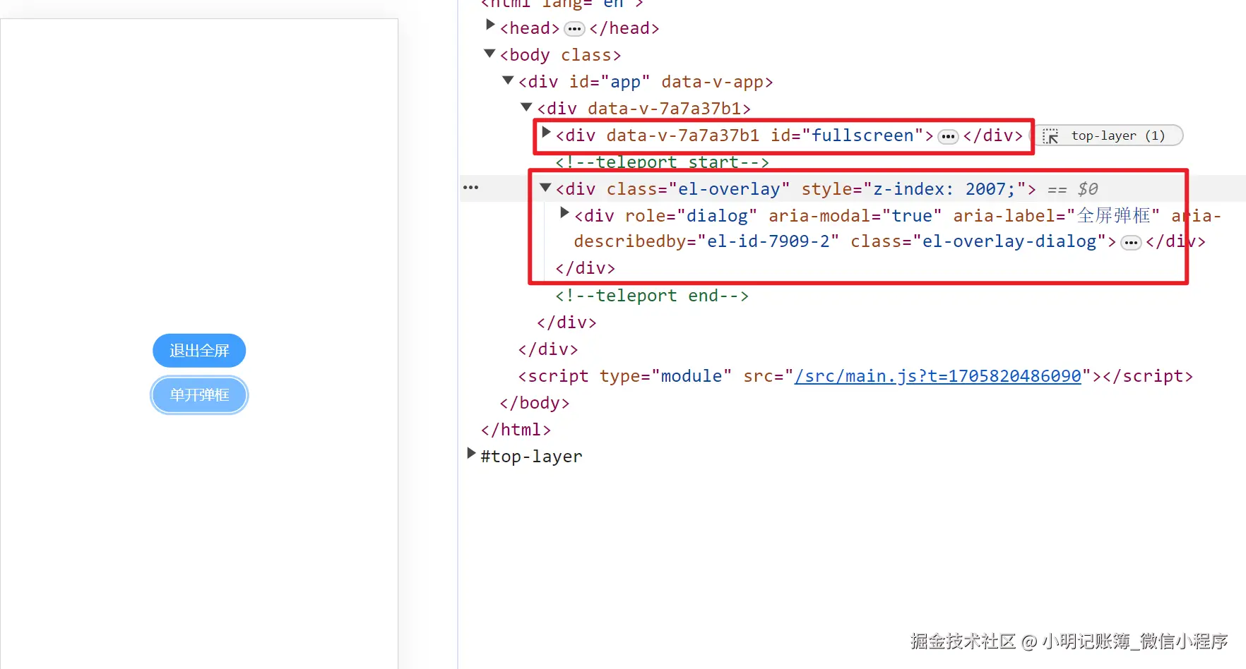 💥 想要全屏的元素都应该在这个Element节点下面,否则的话全屏时不会展示。如下图的html结构,点击单开弹框依然无法在全屏模式下看到弹窗,推出全屏时会看到弹窗已经出现。如果想避免这种莫名的问题,可以把document.getElementById('fullscreen') 改成document.documentElement,让整个HTML全屏。