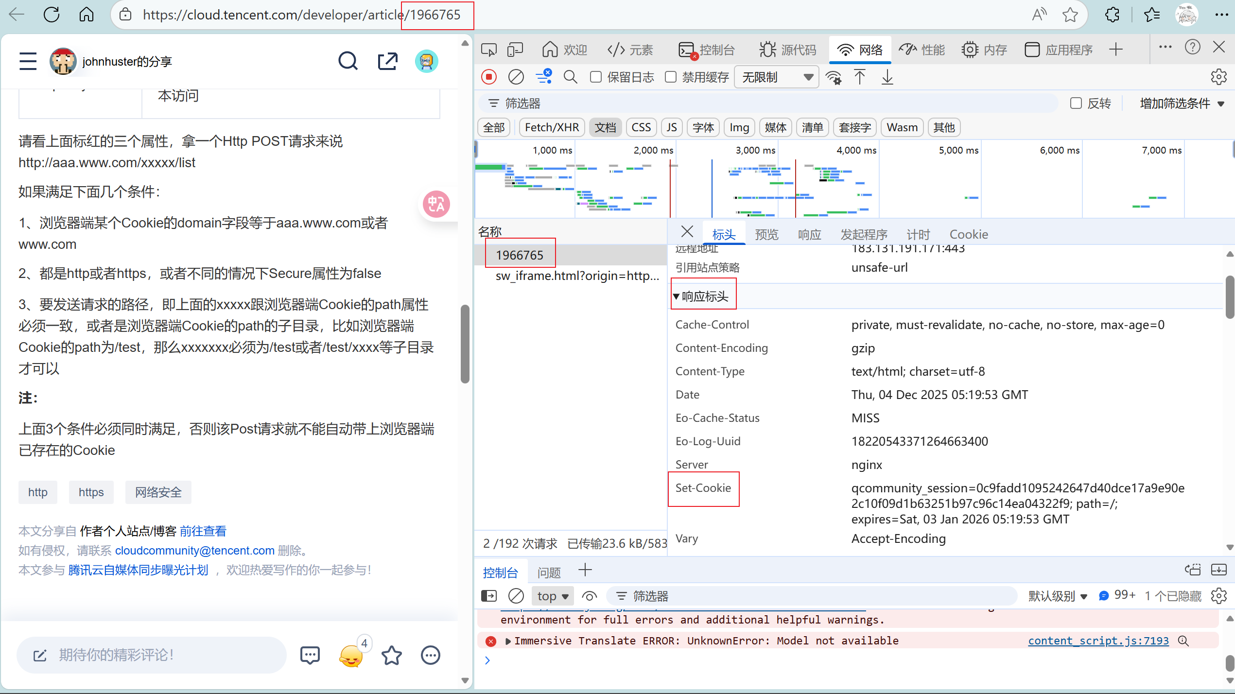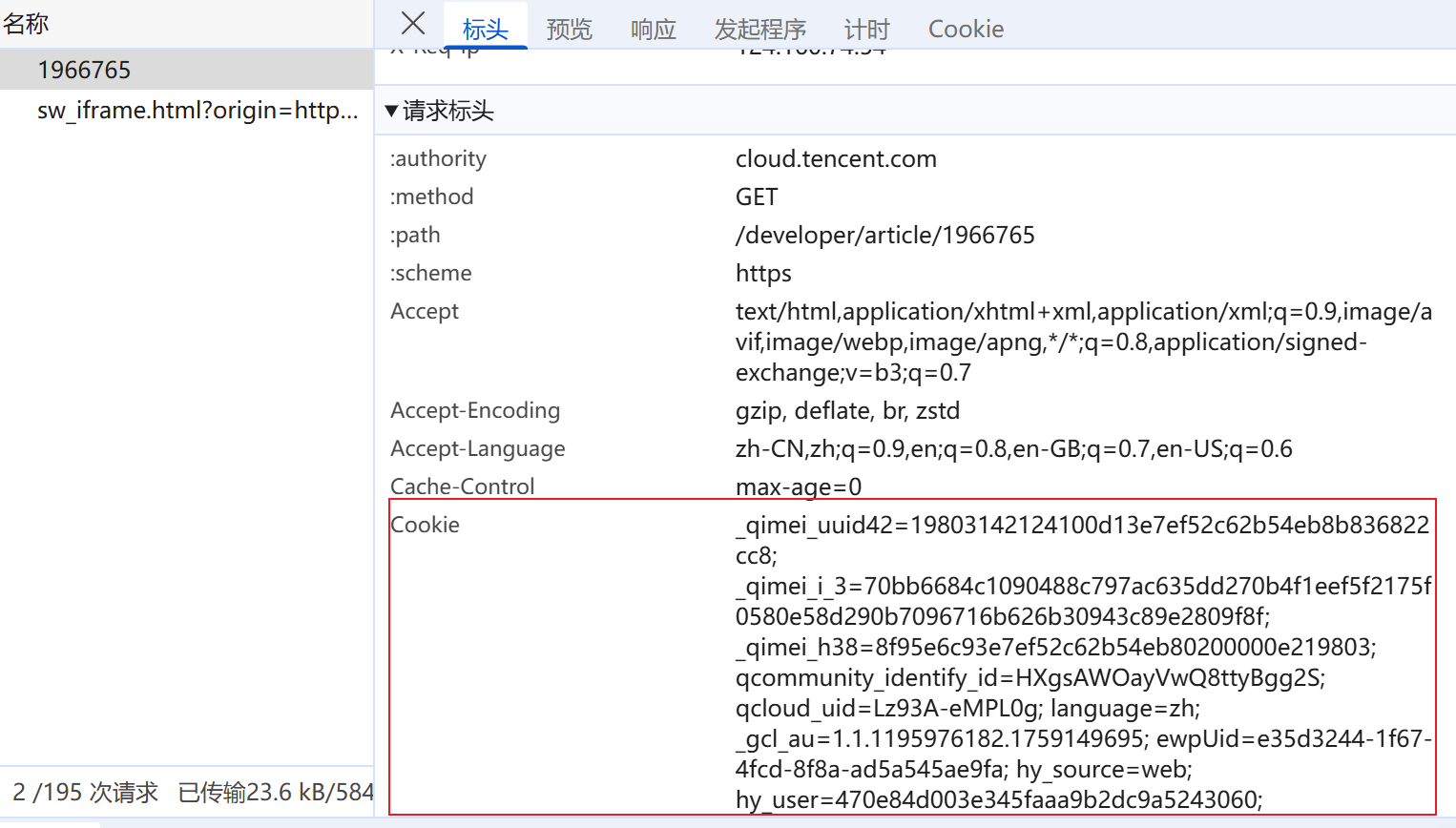这里我们可以看到,响应标头上带了个 set-cookie,与此同时,请求表头上有cookie: