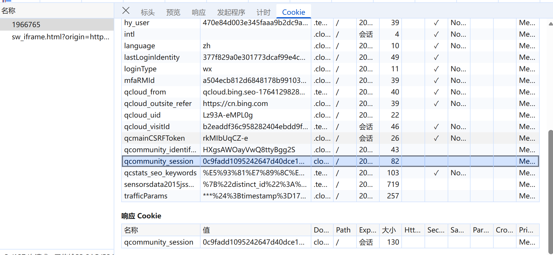 点进cookie的详情部分,能看到请求和响应包里面的session id是一样的,这就是我们要找的部分: