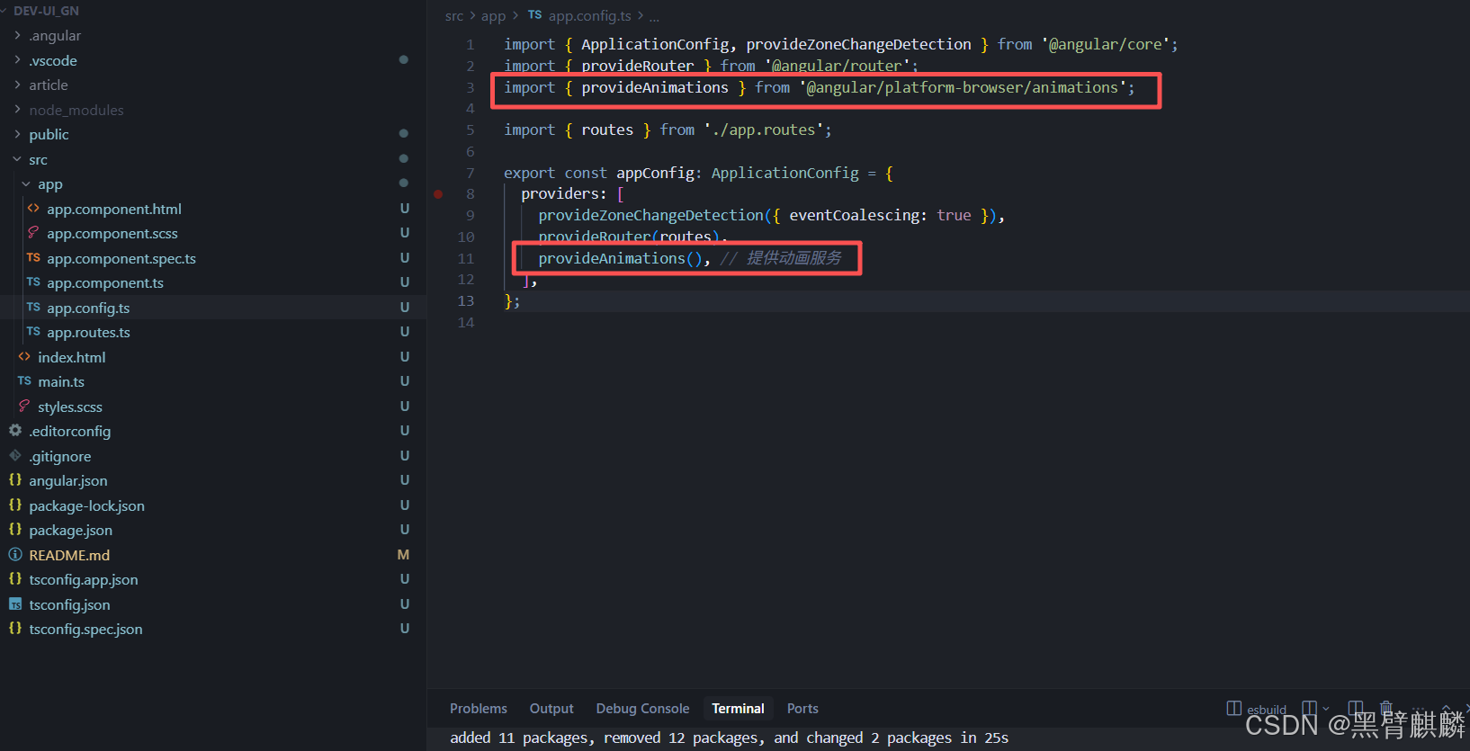 配置应用以支持 DevUI, 由于ang在src/app.config.ts添加动画支持: