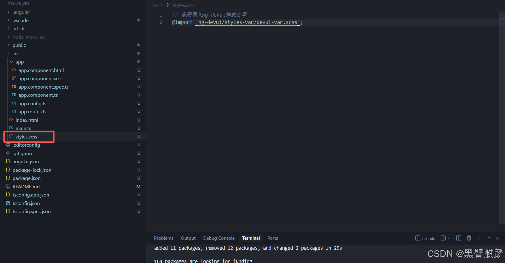 在根目录下的 angular.json 的 styles 属性数组中添加 DevUI 样式:
