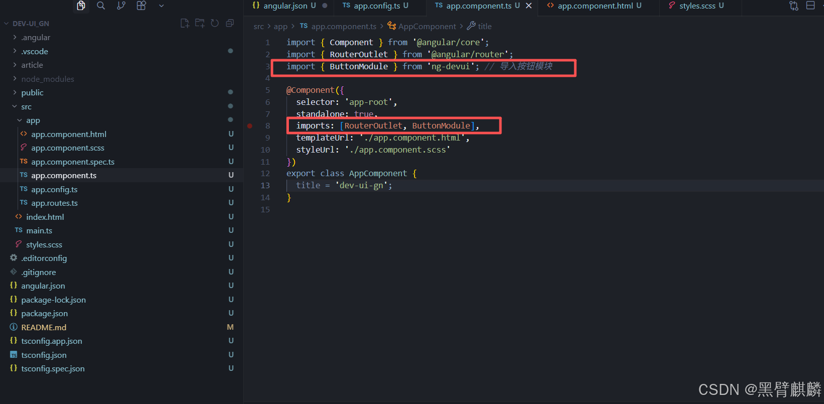 在组件中使用 DevUI 组件,在 app.component.ts 中导入需要的DevUI 模块
