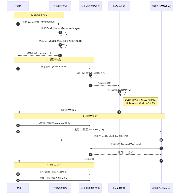 在开始写代码前,让我们通过一张时序图理清整个微调流水线的工作逻辑: