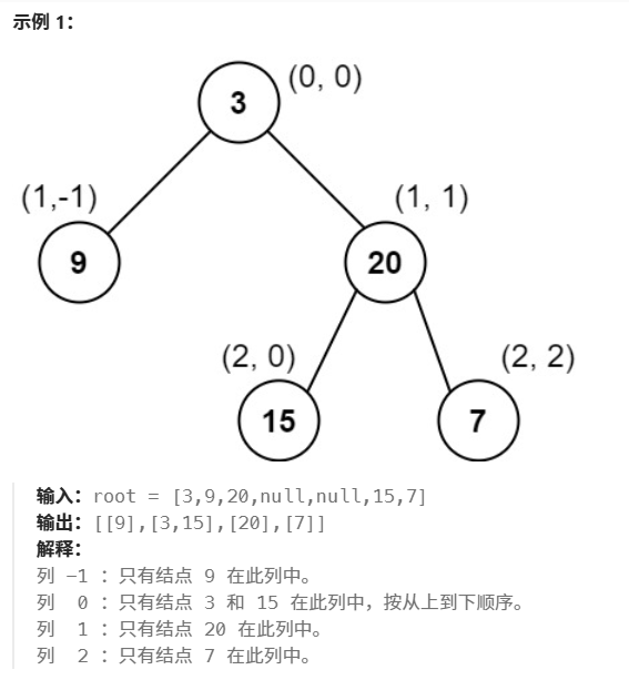 对位于 (row, col) 的每个结点而言,其左右子结点分别位于 (row + 1, col - 1) 和 (row + 1, col + 1) 。树的根结点位于 (0, 0) 。