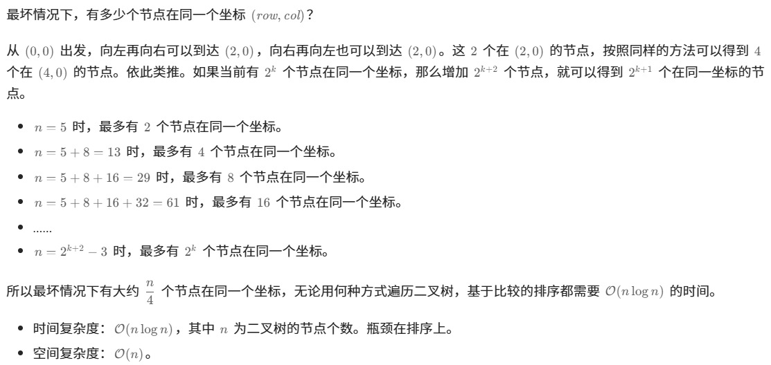 时间复杂度:O(nlogn),其中 n 为二叉树的节点个数。瓶颈在排序上。