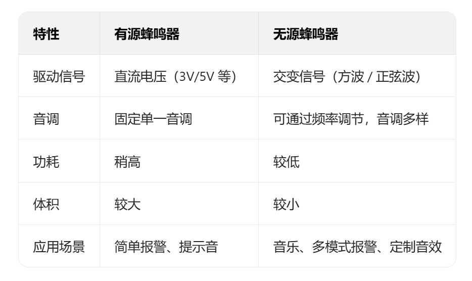 有源蜂鸣器:频率固定(由内置振荡电路决定,常见 4kHz 左右),只能发出单一音调。