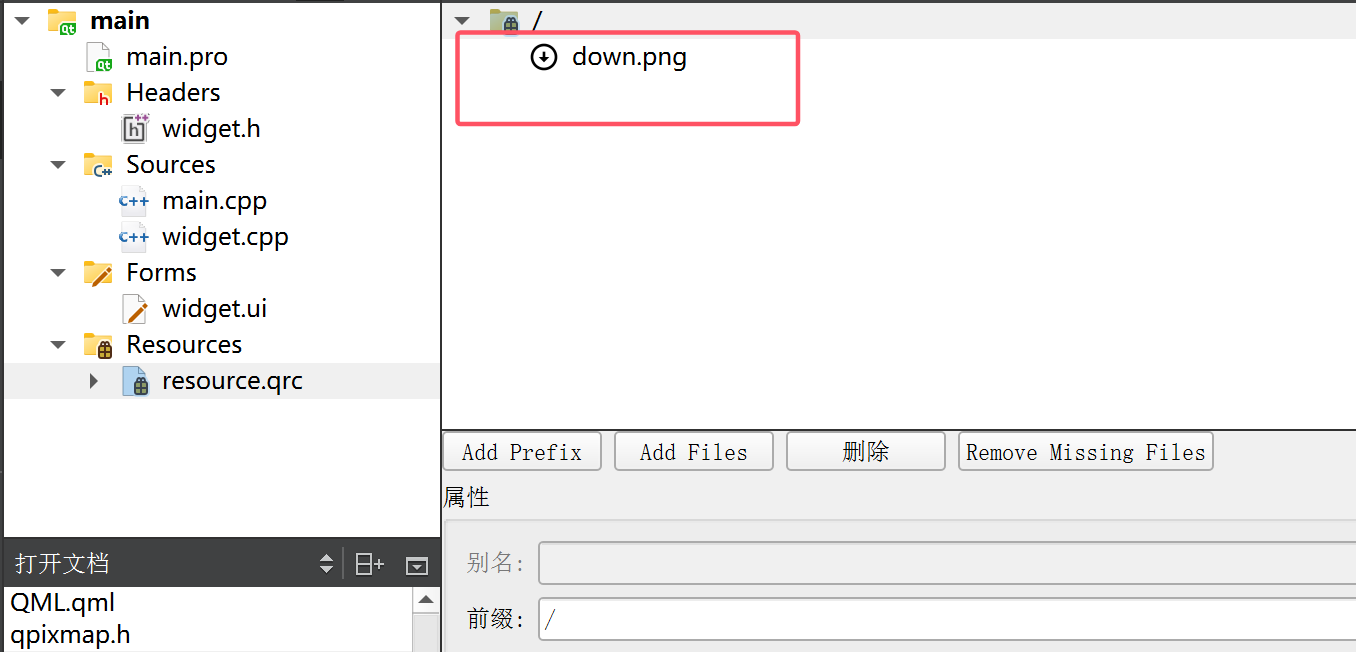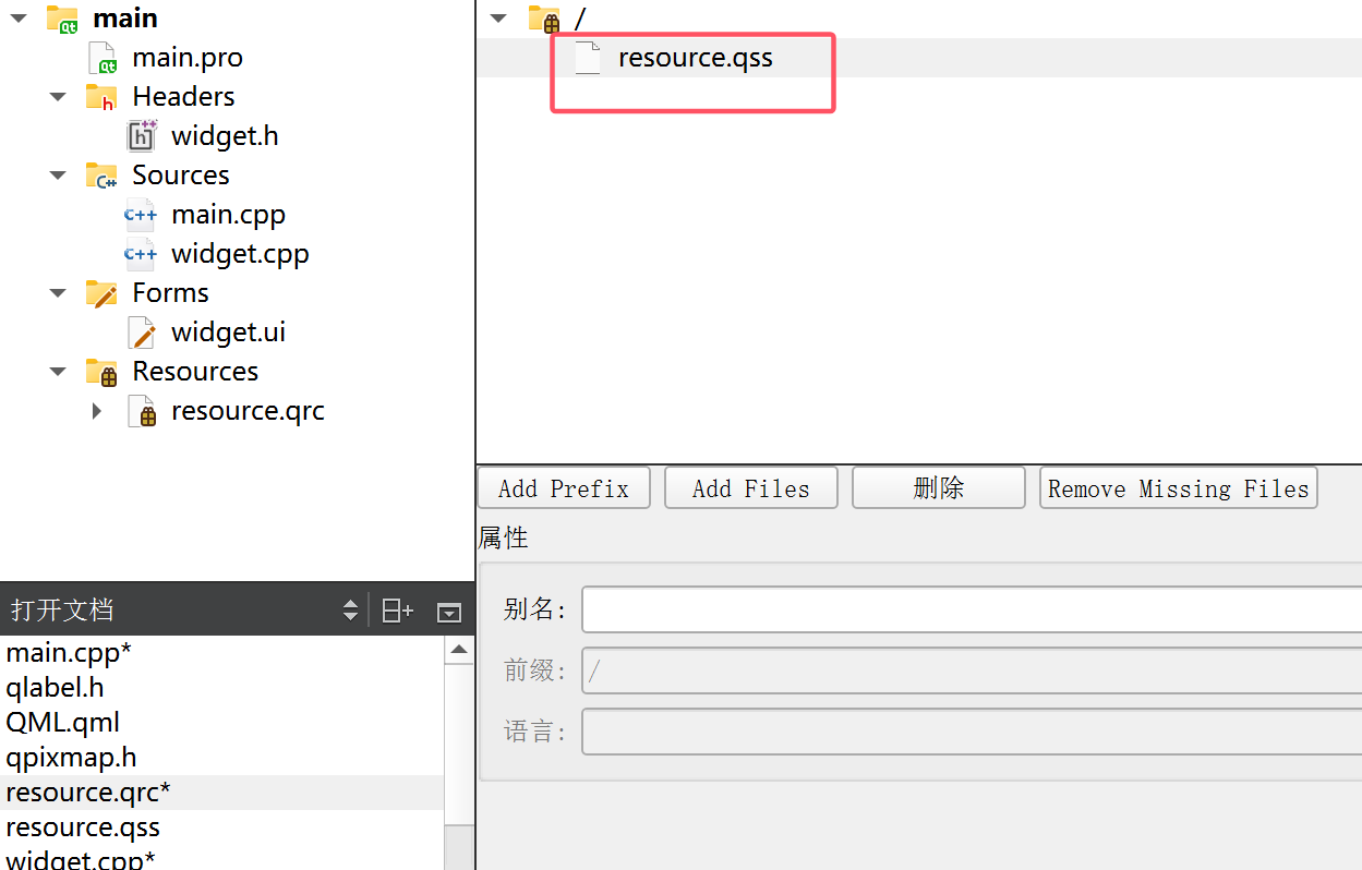 (2)创建 resource.qrc 文件, 并设定前缀为 / ,并添加resource.qss文件