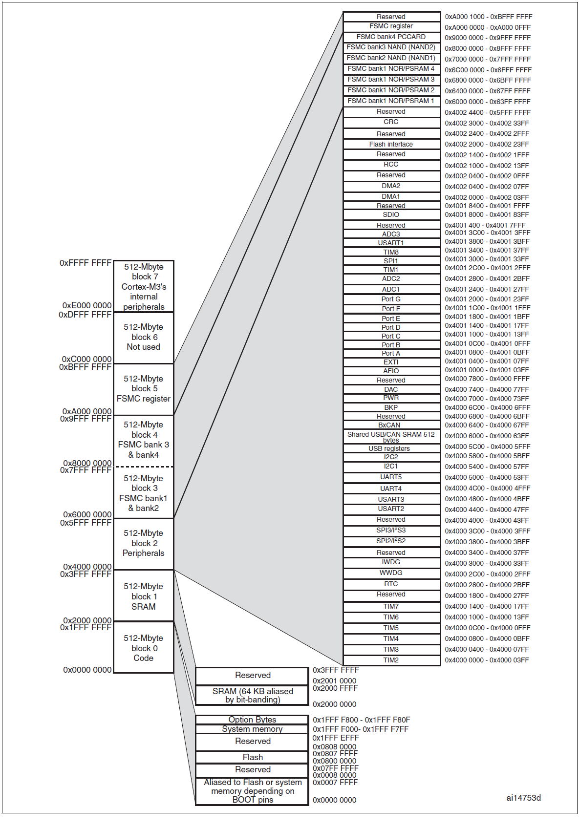 首先要了解,stm32的存储映射解构,解构如图:(该图来自官方手册)