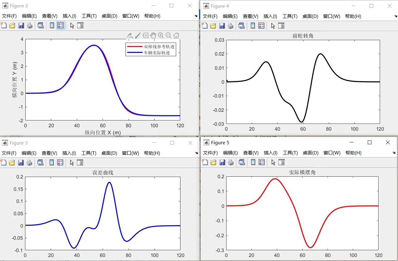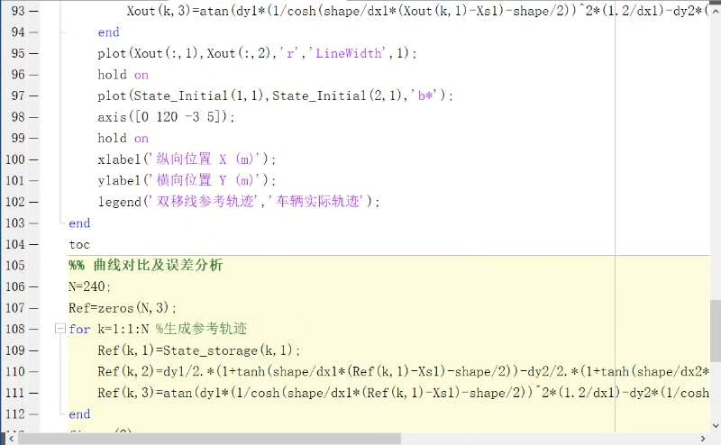 代码计算了横向跟踪误差最大值和横向跟踪误差均方根值,这两个指标能很好地衡量轨迹跟踪的性能。横向跟踪误差最大值反映了跟踪过程中出现的最大偏差,均方根值则综合考虑了整个跟踪过程中的误差情况,更全面地评估算法的准确性。